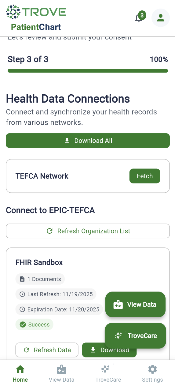 No account needed. Verify your identity, authorize a TEFCA request, and download a complete data bundle. We keep the process transparent and auditable.